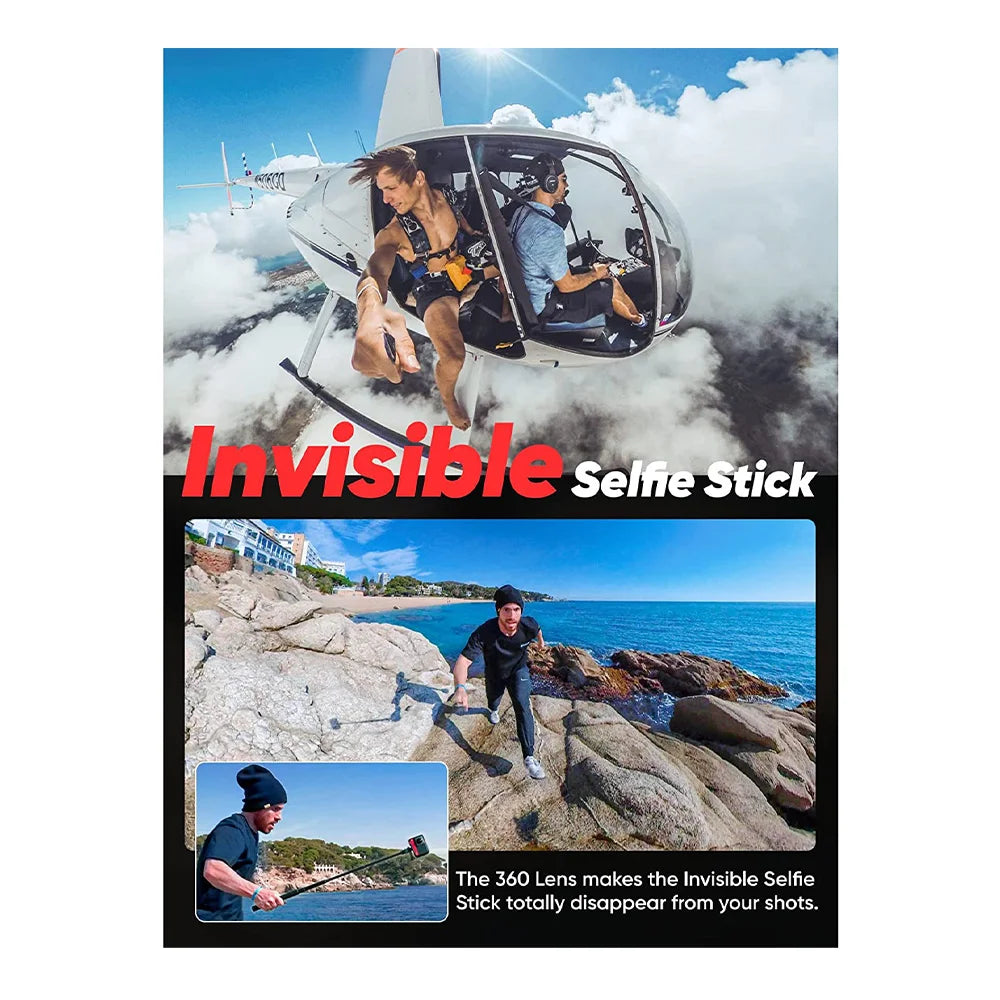 - Invisible Selfie Stick: Don’t ruin the view with an ugly selfie stick! The 360 Lens makes the Invisible Selfie Stick totally disappear from your shots for impossible drone-like footage and third-person perspectives (sold seperatly)